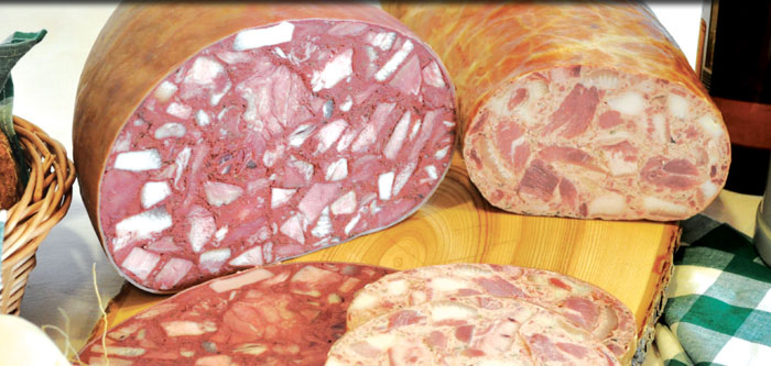 Der fränkische Presssack wird bei uns seit Generationen nach der selben Rezeptur hergestellt. Der "Rote", traditionell in den Schweinemagen gefüllt, ist mit seiner Pfeffer/ Piment-Note ein Muss für jeden Wurstliebhaber, der es rustikal mag. Der "Weiße" ist vor allem durch sein feines Leberaroma und die herzhafte Würzung beliebt und wird, in der Rinderbutte gefüllt, wie sein roter "Bruder" im Buchenholzrauch heiß geräuchert.