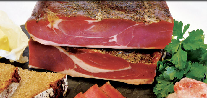 Eine echte Rarität. Dieser rohe Schinken wird bei uns garantiert ohne Zusatzstoffe hergestellt. Mit Mineralstoffreichem Steinsalz gesalzen, darf dieser Schinken mindestens 6 Monate an der fränkischen Luft trocknen und reifen. Er wird aus den Schweinefleisch teilen Unterschale, Nuss und Hüfte zugeschnitten. Grober Pfeffer und eine geheime Kräutermischung geben ihm sein unverwechselbares Aroma.